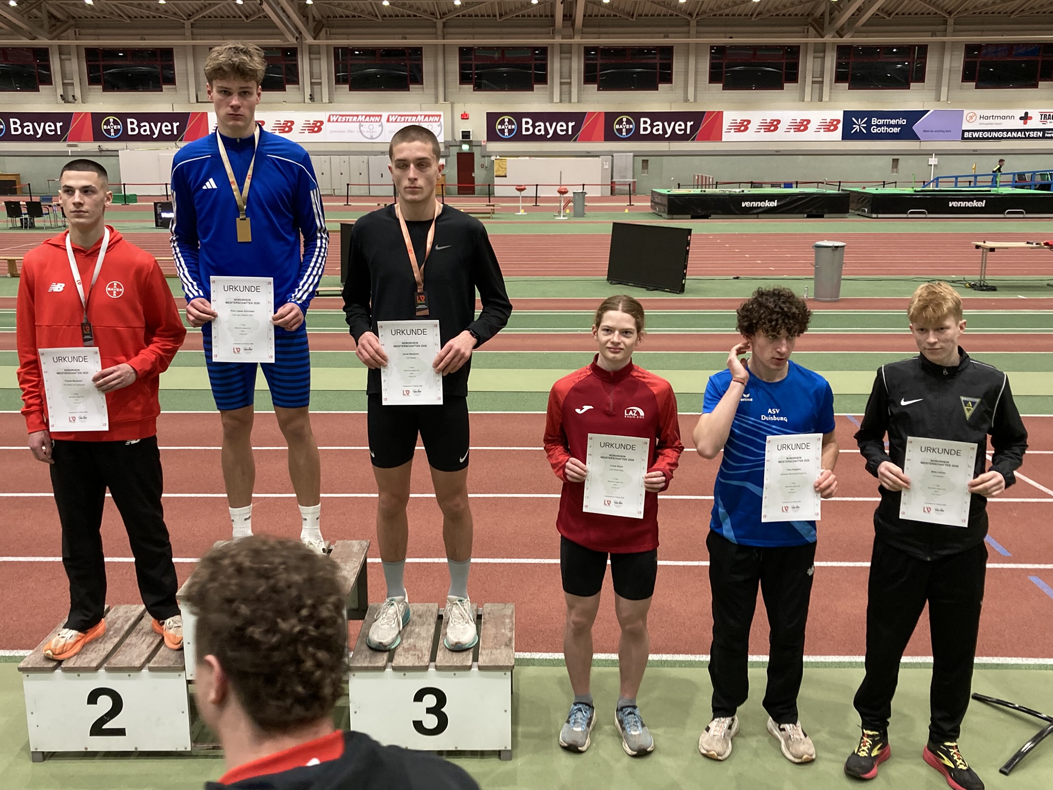 Im Blockmehrkampf Lauf der U16 war Finn Lasse Schröder bereits Nordrheinmeister - jetzt hat er es auch in seiner Spezialdisziplin geschafft, und das im ersten U20-Jahr! Nach mehreren Silber- und Bronzemedaillen über 800m in den letzten Jahren siegte er bei den Hallennordrheinmeisterschaften in Leverkusen in der ältesten Jugendklasse mit neuer Bestzeit von 1:55.00 Min. Damit unterbot er schon zum zweiten Mal in dieser Hallensaison die U20-Norm für die Deutschen Hallenmeisterschaften in Sindelfingen.