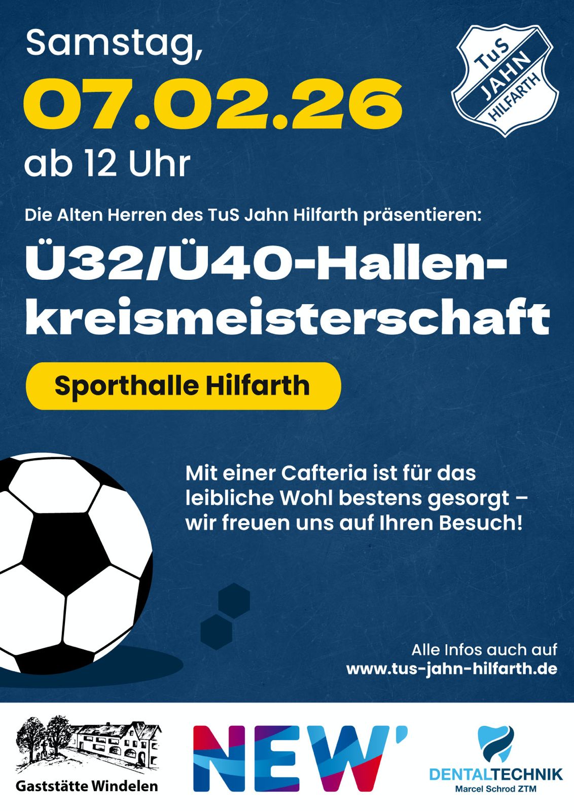 Am Samstag, den 7. Februar 2026, laden die Alten Herren des TuS Jahn Hilfarth erneut zur Ü32- und Ü40-Hallenkreismeisterschaft in die Sporthalle an der Callstraße in Hilfarth ein. Ab 12:00 Uhr rollt der Ball wieder – und wir freuen uns darauf, das Turnier auch in diesem Jahr auf heimischem Boden auszurichten!